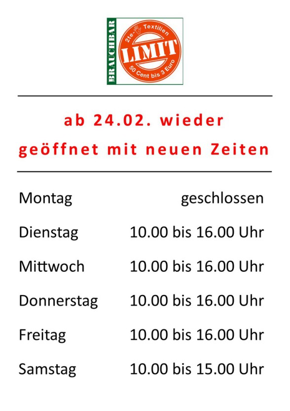 Im Jahr 2006 eröffneten wir in direkter Nähe zum Sozialkaufhaus das Limit. Hier findet sich auch für den kleinen Geldbeutel brauchbare Kleidung, Schuhe, Bettwäsche und vieles mehr. Die Preise liegen bei 1 € pro Teil.
